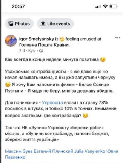 А как же отреагировал на скандал с контрабандой руководитель «Укрпочты» Игорь Смелянский? А очень просто. Вместо серьезного реакции он отделался ироничным и размытым по смыслу постом с призывами и лозунгами, с посылом, дескать, плохие контрабандисты хотят опорочить доброе имя государственного чиновника, который «мзду не берет».
