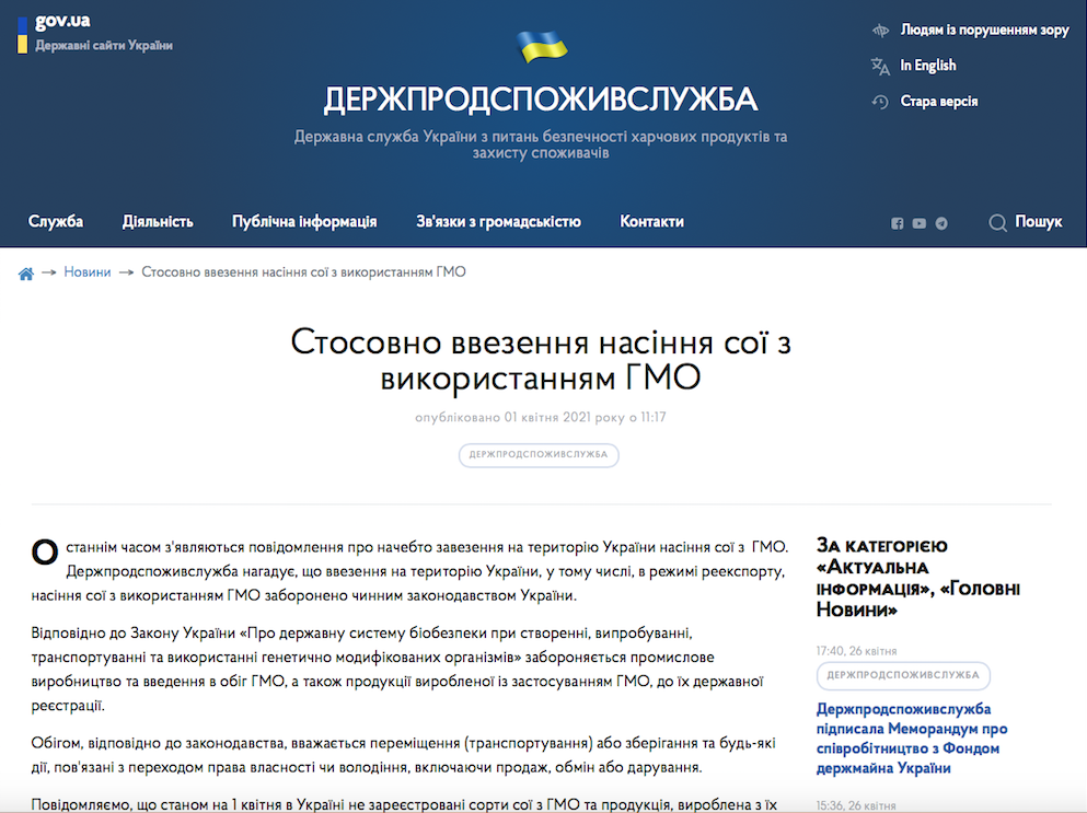 «Останнім часом з’являються повідомлення про начебто завезення на територію України насіння сої з ГМО. Держпродспоживслужба нагадує, що ввезення на територію України, у тому числі, в режимі реекспорту, насіння сої з використанням ГМО заборонено чинним законодавством України… Повідомляємо, що станом на 1 квітня в Україні не зареєстровані сорти сої з ГМО та продукція, вироблена з їх застосуванням. Інформація про ввезення такої продукції також на сьогоднішній день відсутня».