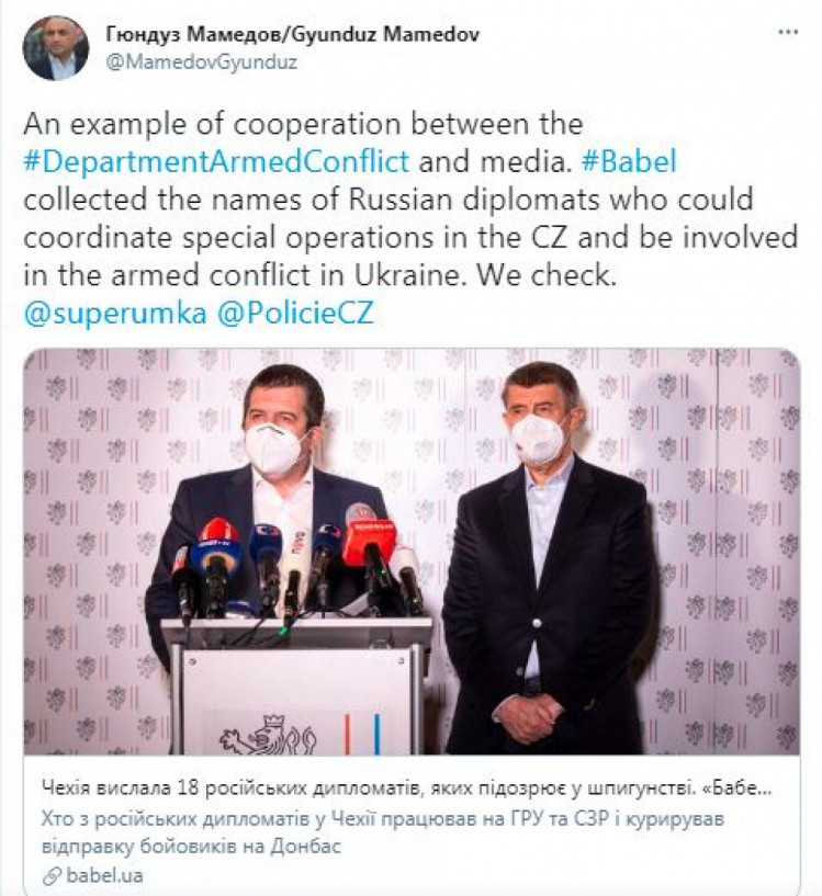 «Пример сотрудничества офиса генпрокурора Украины и СМИ. «Бабель» собрал фамилии российских дипломатов, которые могли координировать спецоперации в Чехии и быть причастными к вооруженному конфликту в Украине. Проверяем», — написал Мамедов.