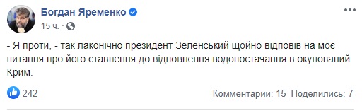 На вопрос нардепа от «Слуги народа» Богдана Яременко президент ответил короткое «я против». Об этом депутат написал в своём Facebook и позже добавил, что по поводу гастролей артистов в Украине, которые ездили в оккупированный Крым, Зеленского даже не стоит спрашивать.