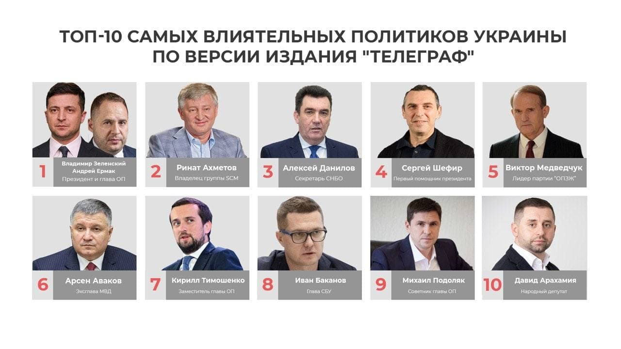 Популярный сайт Телеграф составил рейтинг самых влиятельных политиков 2021 года. Стоит отметить, что в первой пятерке рейтинга, кроме президента Владимира Зеленского, оказались представители его команды из Офиса президента и СНБО, бизнесмен Ринат Ахметов и лидер партии «Оппозиционная платформа — За жизнь» Виктор Медведчук.