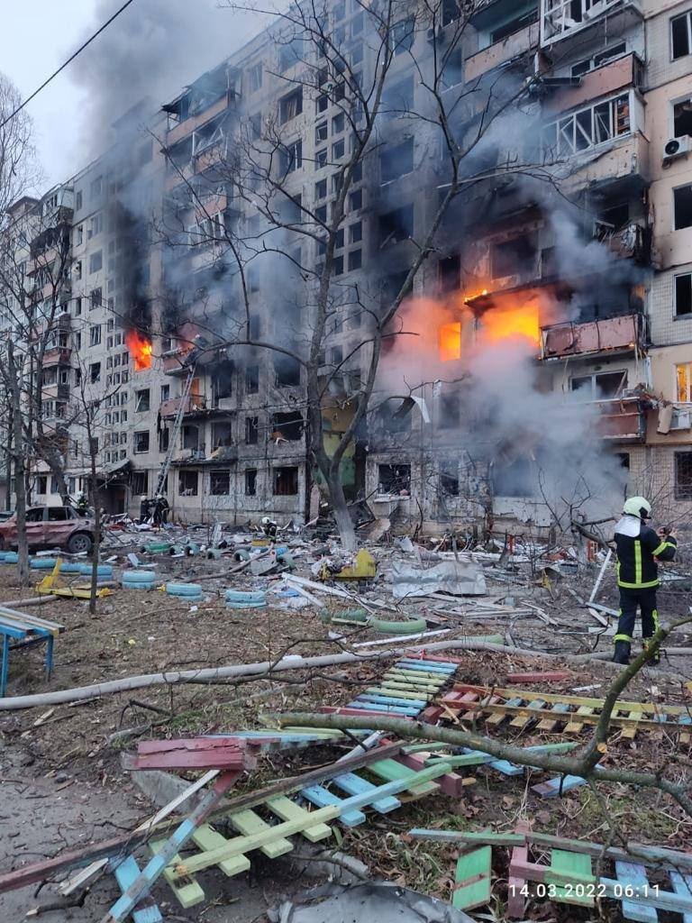 Утром 14 марта в Оболонском районе Киева вражеский артиллерийский снаряд попал в девятиэтажный жилой дом.