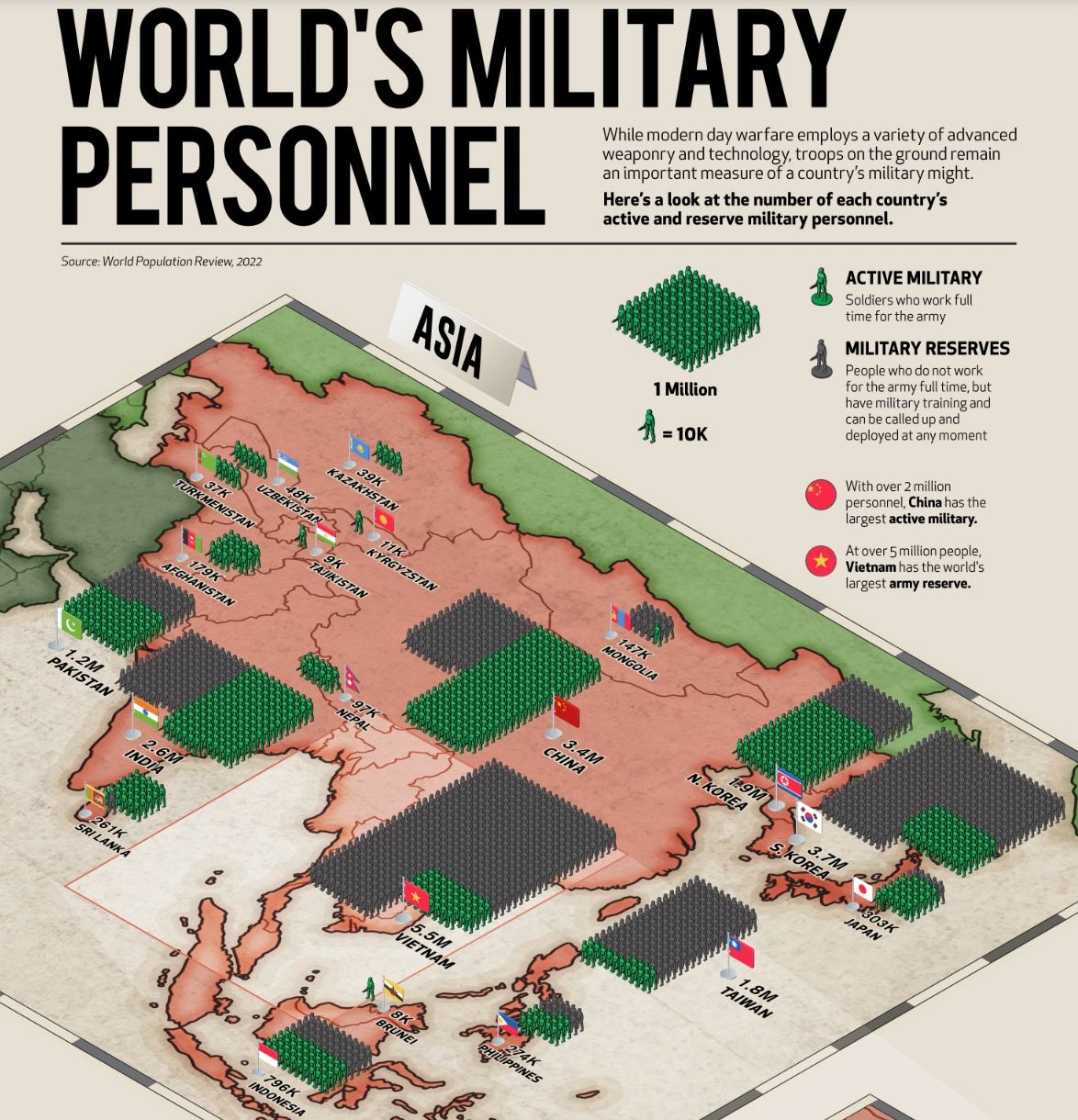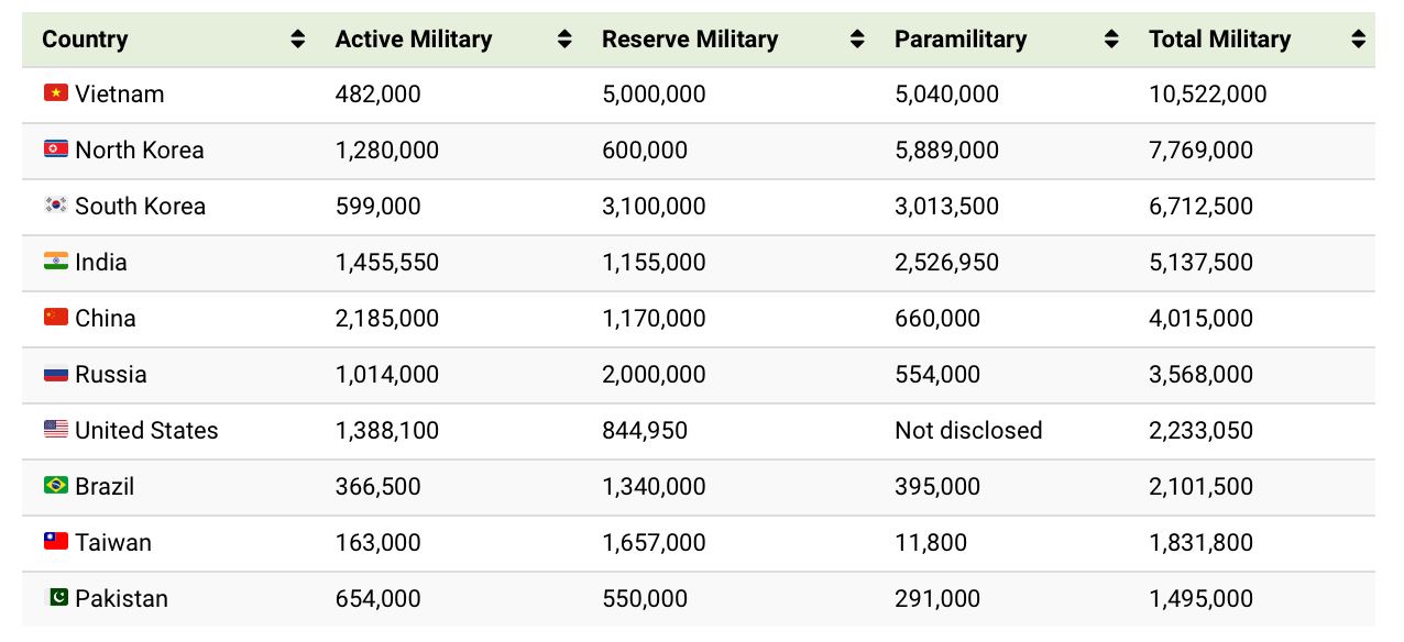 Наибольшее количество действующих военнослужащих – в Китае (более 2 млн), военный резерв самый большой во Вьетнаме: это люди, имеющие военную подготовку, и могут быть призваны в любой момент.