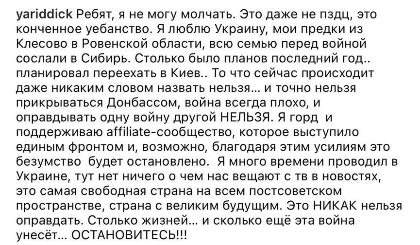 У самій компанії Pin-Up.Tech про війну росії проти України схоже вважають за краще не говорити. Ми прочитали пости та інтерв’ю компанії від 24 лютого і в жодному не знайшли слів «повномасштабна війна росії проти України» і навіть слова «росія». Немає цих слів і в пості «Ріддіка» в його закритому Instagram-акаунті.