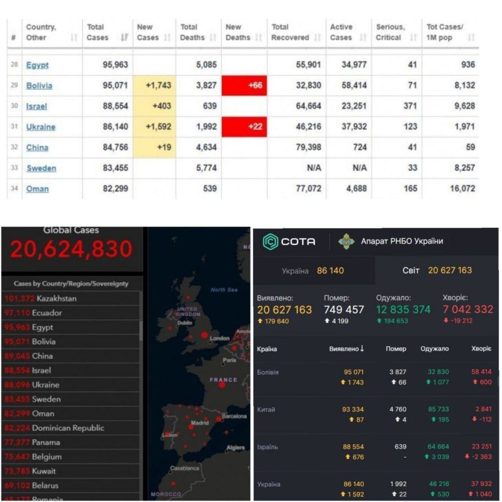 Но если посмотреть на данные центра Джона Хопкинса и карту СНБО, то Украина все же отстает от Китая. В центре Джона Хопкинса отмечают, что за время пандемии в Китае заболели 89 045 человек, в Украине — 88 096. СНБО показывает другие цифры — в Китае 93 334 случая, в Украине — 86 140.