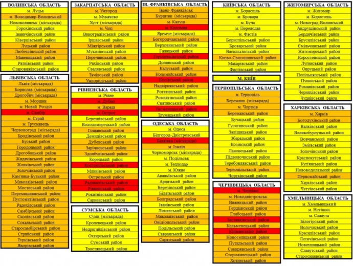До червоної зони буде віднесено: місто Коломия, Городенківський, Косівський та Тисменицький райони Івано-Франківської області; місто Самбір Львівської області; місто Біляївка Одеської області; міста Дубно та Острог, Костопільський, Радивилівський та Рівненський район Рівненської області; місто Чернівці, Заставнівський та Кіцманський район Чернівецької області.