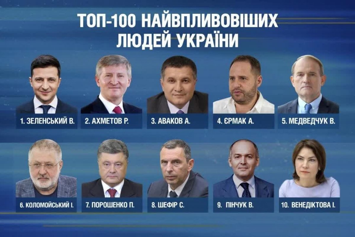 В первую десятку рейтинга вошли ряд политиков и бизнесменов, а именно: Владимир Зеленский, президент Украины, Ринат Ахметов, владелец группы компаний СКМ, Арсен Аваков, глава МВД, Андрей Ермак, глава Офиса президента, Виктор Медведчук, глава политсовета партии «Оппозиционная платформа — За жизнь», Игорь Коломойский, совладелец финансово-промышленной группы «Приват», Виктор Пинчук, бизнесмен, основатель EastOne Group, Ирина Венедиктова, генеральный прокурор.