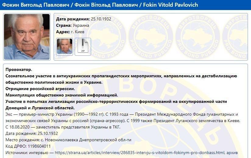 Украинский сайт «Миротворец» внес в свою базу данные о бывшем премьер-министре страны, члене украинской делегации в трехсторонней контактной группе Витольде Фокине.