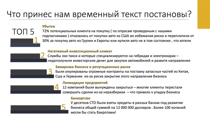 Между тем, как отметил соучредитель ассоциации Владимир Ковель, за время с момента обнародования постановления (февраль 2020 года) произошли негативные изменения, в частности, согласно проведенным ими опросам, около 72% потенциальных клиентов отказались от покупки авто из США во избежание риска и переплатили от 30% за покупку авто из Грузии и Европы или купили авто не в том состоянии, как хотелось.