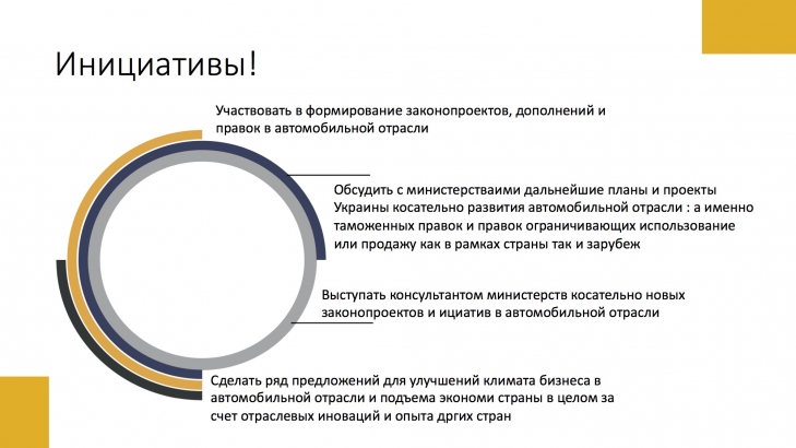 «Мы планируем сделать влиятельный орган, который будет участвовать в формировании законопроектов, правок и дополнений, касающихся автоотрасли, в обсуждении с профильными министерствами планируемых изменений законодательства, которые могут ограничить продажу авто», — сообщил руководитель ассоциации, соучредитель компании «Колумб Трейд» Павел Казарьян на пресс-конференции в агентстве «Интерфакс-Украина» во вторник.