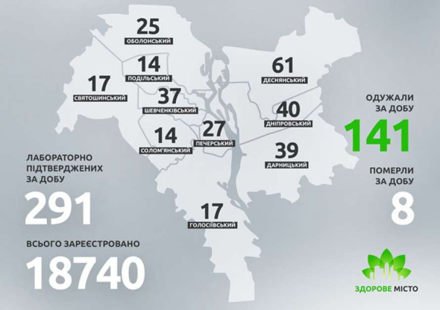 За последние сутки в г. Киев выявлено 291 новых случаев заболевания COVID-19, умерли 8 человек.