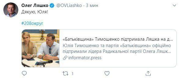 Тем временем Ляшко уже успел выразить свою благодарность Тимошенко в Twitter.
