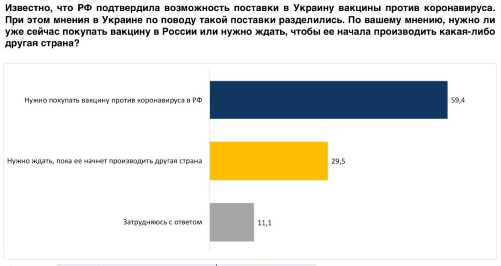 На вопрос о том нужно ли покупать вакцину против коронавируса в РФ либо ждать пока ее начнет производить какая-либо другая страна, почти 60% респондентов заявили, что Украина должна покупать вакцину в РФ. Противоположное мнение высказали 29,5% опрошенных, еще 11,1% затруднились ответить на этот вопрос.