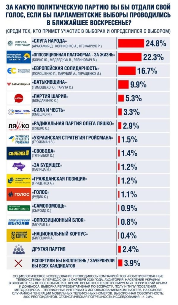 Если бы выборы в Верховную Раду Украины проходили в ближайшее воскресенье, то в следующий состав парламента прошли бы 5 политических партий: «Слуга народа» (Д. Арахамия, А. Корниенко, Р. Стефанчук) – 24,8%, «Оппозиционная платформа – За жизнь» (Ю. Бойко, В. Медведчук, В. Рабинович) – 22,3%, «Европейская солидарность» (П. Порошенко, А. Парубий, И. Геращенко) – 16,7%, ВО «Батькивщина» (Ю. Тимошенко, С. Тарута) – 9,9% и «Партия Шария» (О. Бондаренко) – 5,3%.