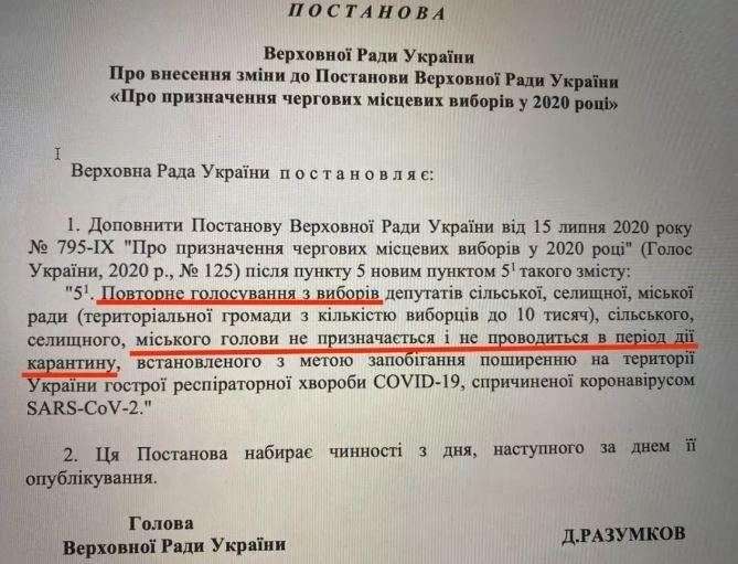 Как указано в постановлении, за которое предлагают проголосовать Верховной Раде — повторное голосование по выборам депутатов сельского, поселкового, городского совета (территориальной общины с количеством избирателей в 10 000), сельского, поселкового, городского головы не назначается и не проводится в период действия карантина, установленного с целью предотвращения распространения на территории Украины острой респираторной болезни COVID-19, вызванной коронавируса SARS-CoV-2 ».